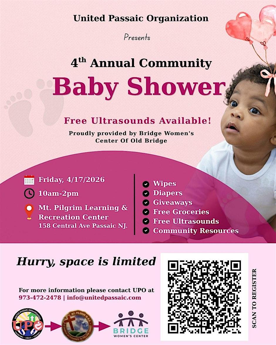 The Bridge Women's Center is excited to join the United Passaic Organization for their 4th Annual Community Baby Shower! Join us for a day filled with ultrasounds, fun, games, and giveaways to celebrate the community's newest additions. The event will be held in person at MT. PILGRIM MISSIONARY BAPTIST CHURCH 158 Central Avenue, Passaic, NJ 07055. Whether you're a parent-to-be, a new parent, or just want to show your support, this event is for you. Come and enjoy the festivities with us!